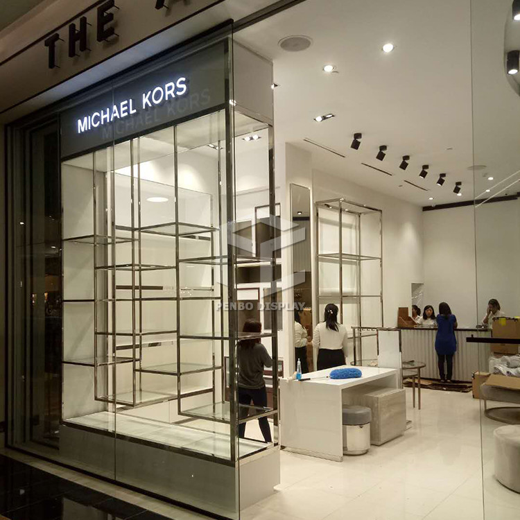 เราทำงานร่วมกับแบรนด์ที่มีชื่อเสียงทั่วโลก: Michael Kors วัสดุหลักคือเหล็กสแตนเลสและ MDF สแตนเลสเป็นพิเศษสำหรับตู้โชว์ระดับสูงบางรุ่น MDF สามารถทาสีสีและสร้างรูปร่างใด ๆ ที่เข้าถึงได้ง่ายขึ้น ลุคไฮเอนด์